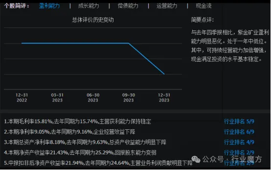 与2022年四季报相比,2023年四季报,紫金矿业盈利能力明显恶化。处于一年中低位。其中,可持续经营能力加倍增强,现金满足投资的水平基本稳定。。