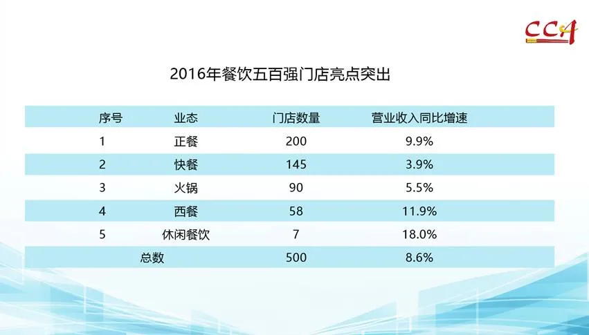 2016年餐饮百强企业和五百强门店中,快餐、火锅、餐馆酒楼依然是发展主力业态,而快餐还未完全摆脱颓势,消费者在要求餐饮“快”的同时,也对产品质量有较高的需求,这也是快餐亟待突破的地方。