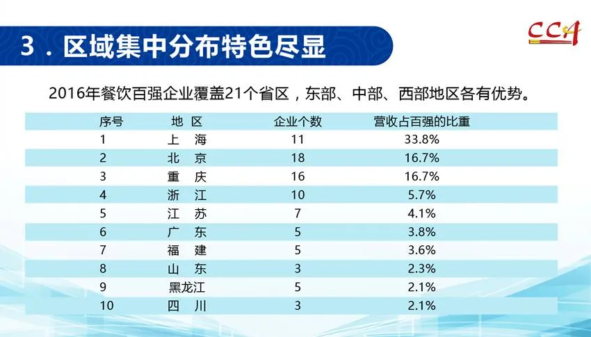 2016年,餐饮市场在上年迅速回暖后呈现理性发展态势,餐饮百强企业随之调整分布版图。