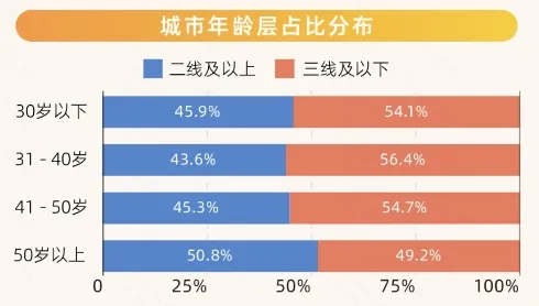 能够最先识别到低线城市消费者需求、消费意识转变的连锁品牌,往往能够在市场发展初期就获取大量的成长红利,蜜雪冰城、塔斯汀、瑞幸等品牌在低线城市能够开启“大跃进”模式,很大程度上也都归因于此。那么,下沉市场的消费有何特点?综合多个维度来看,下沉市场消费业态的升级以及所展现出来的蓬勃活力背后,低线城市在消费人群、消费习惯等方面有着一套不同于一二线城市的逻辑。在一二线城市,人与人之间都是流动性的工作社交模式,大都希望维持在弱关系里。但下沉市场是熟人社会,在这里熟客的价值远超新客,地方名人或者亲朋好友的推荐,往往是影响消费决策的重要因素。因此,熟人社交加上极致性价比,就会成为品牌攻入大众市场的“杀手锏”。比如,拼多多的拼团、砍价等功能具有强烈社交属性,再加上低价策略,从而让其在下沉市场的流行度远超一二线城市;快手平台上的达人,通过与本地粉丝的互动,建立与粉丝的粘性,再通过视频团购渠道推出更优惠、评价更好的套餐,形成强社交,承包了不少低线城市消费者的“吃喝玩乐”。相比生活在一二线的人们,低线城市的人们接触互联网的时间更多,他们有大量的空闲时间,也不会选择屏蔽谁。大家的关系网也比较简单,一旦触达到“小圈子”,就会在强社交氛围下,形成了独特的老铁经济,促使信任关系不断推高,最终也为商家提升交易规模。2、31-50岁中坚力量挑大梁,女性用户的消费潜力巨大提到下沉市场的消费人群,很多人会自然而然想到“小镇青年”,但事实上,小镇青年只是一小撮,并非下沉市场的消费主体。在低线城市,真正的主力消费群体,是那些31-50岁之间的熟男熟女。《快手本地生活用户洞察报告》显示,低线城市中坚用户群体规模扩张迅速,2023Q4较2023Q1,这些城市的中坚用户规模占比提升27.6%。这部分人群处在追求自我实现的高消费阶段,有钱有闲,在吃穿用度上会更舍得花钱,抓住了他们其实就等于抓住了下沉市场的半壁江山。而这当中,女性人群的购买力会更强。快手本地生活的数据显示,截止2023年第4季度,在低线城市,女性消费群体占比高出二线以上城市5%。也就是说,低线城市女性用户有着更大的消费潜力。