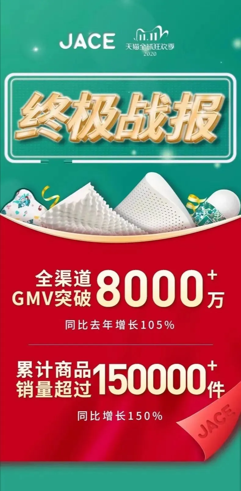 根据生意参谋数据显示,今年双十一期间,进入中国市场不满 5 年的高端寝具品牌JACE(久适生活),以全渠道销售额8000万、同比增长105%的战绩,强势霸榜天猫床上用品枕头类目top1(数据来源生意参谋:2020年11月3日)。其中负离子乳胶床垫、泰国天然乳胶可调节狼牙枕、乳胶保暖垫、天然乳胶护脊弹簧床垫,这4款单品销量破千万,后2款尚且还是今年刚推出的秋冬新品。