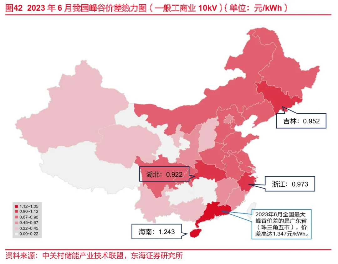 近年来,国内各地主动拉大用电侧峰谷价差,拓宽工商业储能盈利空间,间接带动工商业储能发展。2021年发改委推出的《关于进一步完善分时电价机制的通知》,在保持电价总水平稳定的基础上,更好引导用电侧削峰填谷、改善电力供需状况、促进新能源消纳,并要求各地科学划分峰谷时段、合理确定峰谷电价价差。根据CNESA数据,2023年6月全国共计19个省份的最大峰谷价差超过0.6元/kWh,其中广东省(珠三角五市)的峰谷价差最大,达到1.347 元/kWh,超过第二名(海南省)约0.1元/kWh。