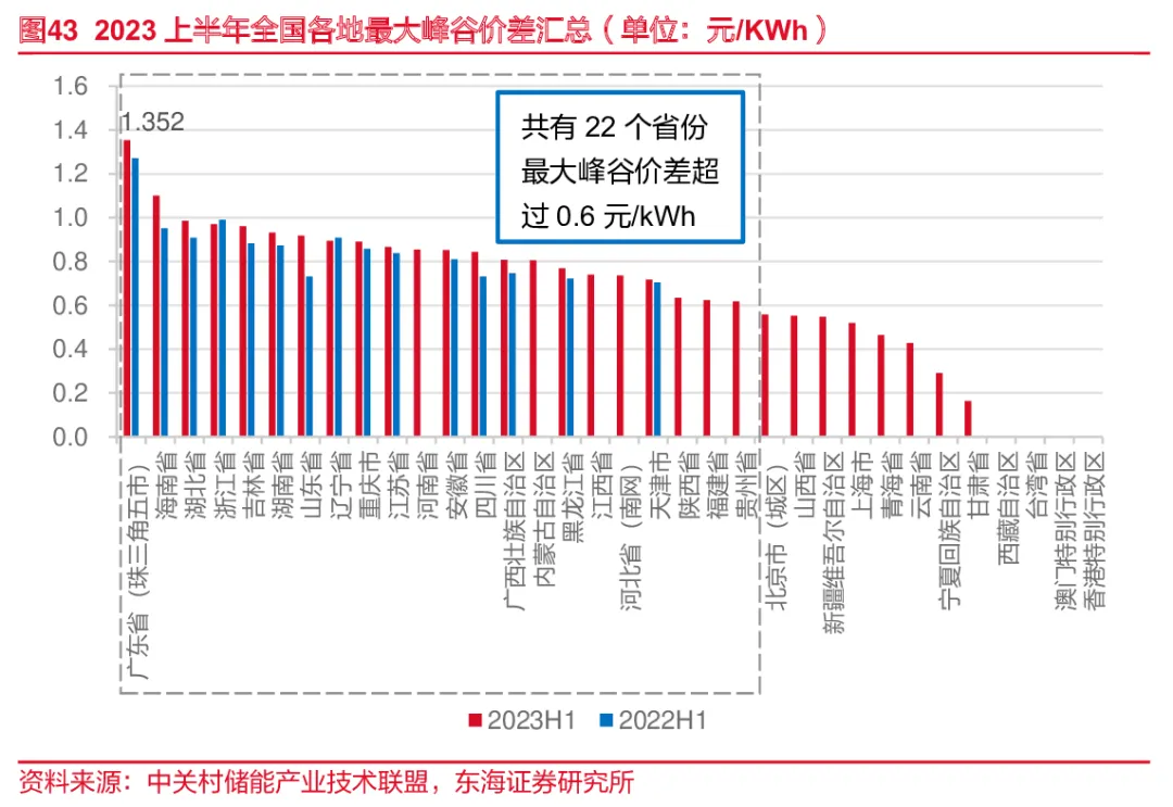 2023H1我国共有22个省份最大峰谷价差超过0.6 元/KWh,大部分省份的峰谷价差相较于去年同期在持续拉大。最大峰谷价差位列前五的分别是广东省(珠三角五市)1.352元/KWh、海南省1.099 元/KWh、湖北省0.985元/KWh、浙江省0.970 元/KWh、吉林省0.961元/KWh。