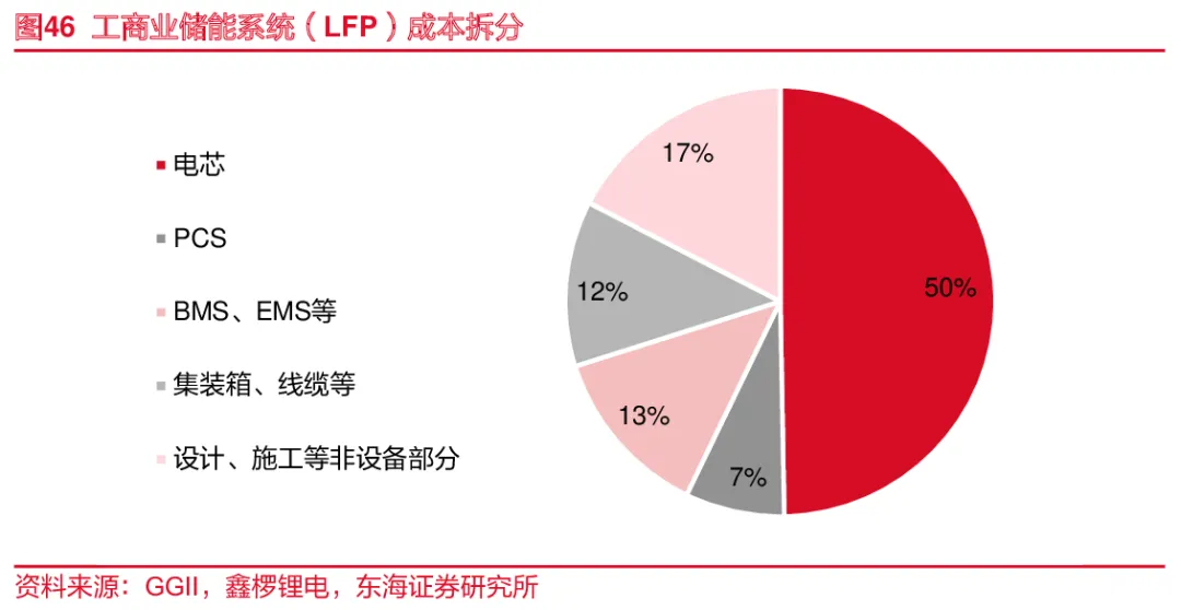工商业储能系统成本拆分。电芯成本为1.00元/Wh,占比约50%;PCS成本为0.15元/Wh,占比约7%;BMS、EMS等成本为0.26元/Wh,占比约13%;集装箱、线缆等成本为0.25元/Wh,占比约 12%;设计、施工等非设施部分成本为0.35元/Wh,占比约17%。