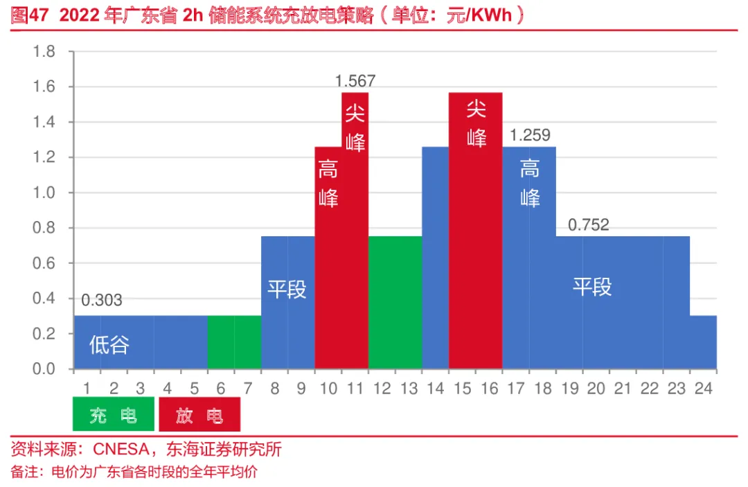 储能系统运营机制。以2022年广东省储能系统充放电策略为例。广东省每日用电高峰为14:00-19:00(其中尖峰电价在高峰段基础上提升20%,执行时间为每年7、8、9月以及单日温度超过35℃)。因此储能系统会在每日6:00-8:00低谷时段充电,在10:00-12:00高峰段放电;在12:00-14:00平段充电,在15:00-17:00高峰段放电。即该储能系统在低谷和平段时充电,在两个高峰时放电,达到每日两次的充放电,使系统效用最大化、缩短项目静态回收期。