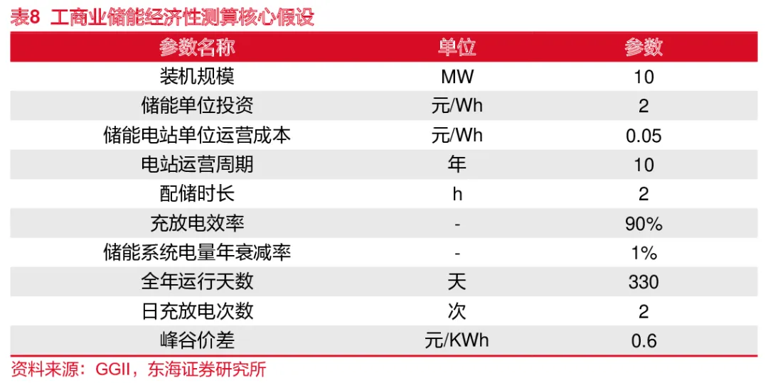 工商业储能经济性测算核心假设。假定储能装机规模为10MW,用户侧使用时可使储能系统完全充放电,储能系统单位投资额为2元/Wh,每天充放电次数为2次,配储时长2h,运营周期为10年,峰谷价差为0.6元/kWh,其IRR约7.6%,预计6.7年可以收回投资。