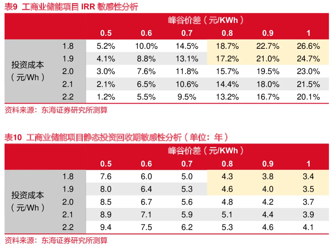 我们认为,随着政策端的引导,未来各地峰谷价差将会进一步扩大,同时规模效应带来的储能系统初始投资额下行,工商业储能的经济性凸显。进一步测算,通过对储能系统的敏感性分析,当储能系统的初始投资成本为2元/Wh、峰谷价差大于0.7元/kWh时,工商业储能项目的IRR可超15%。待行业成熟,初始投资成本为1.8元/Wh、峰谷价差为1元/kWh 时,储能项目的IRR可达26.6%,静态投资回收期仅为3.4年,此时项目盈利能力显著提升、流动性风险大幅降低。