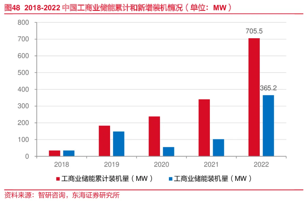 随着峰谷价差持续拉大,工商业储能盈利能力加强,国内工商业储能发展加速。2022年,我国工商业储能新增装机规模365.2MW,装机累计规模达到705.5MW。