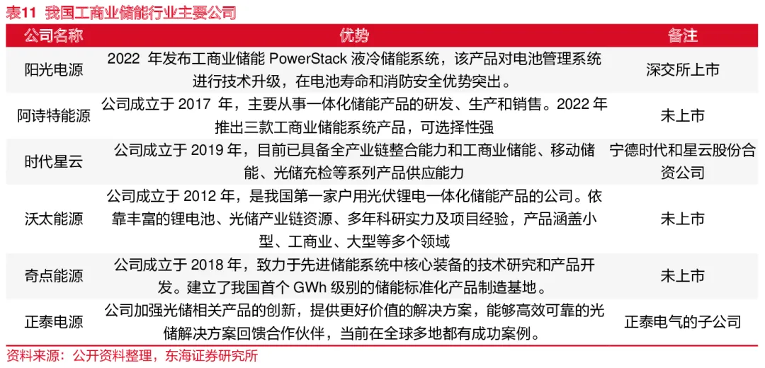 目前国内规模较大的工商业储能系统一体化公司包括阳光电源、阿诗特能源、时代星云、 沃太能源、奇点能源、正泰电源等。行业尚处发展初期,各公司处于探索阶段,未来新进企业可以通过融资、产品差异化开发、拓宽销售渠道和提升品牌形象等方式实现弯道超车。