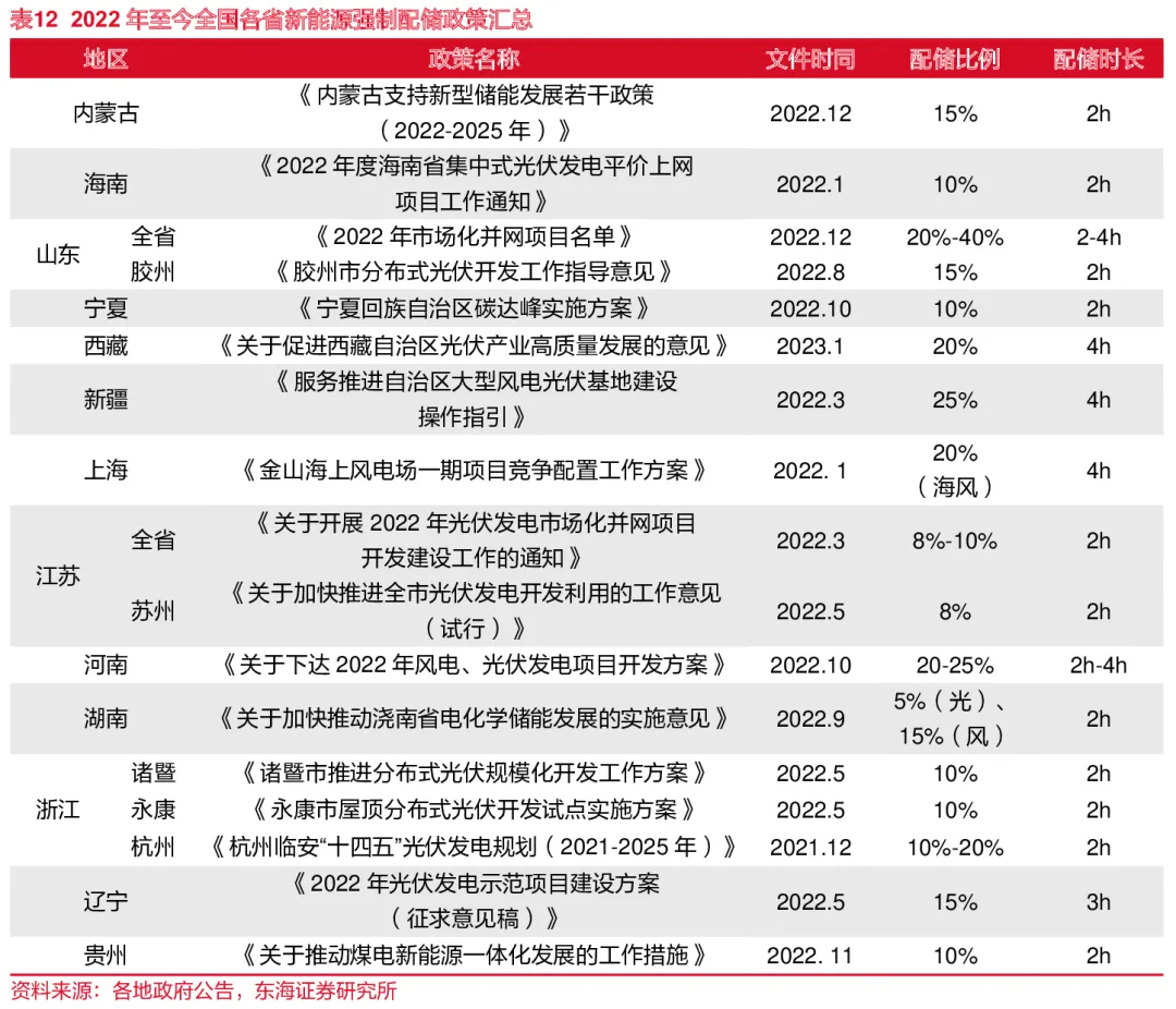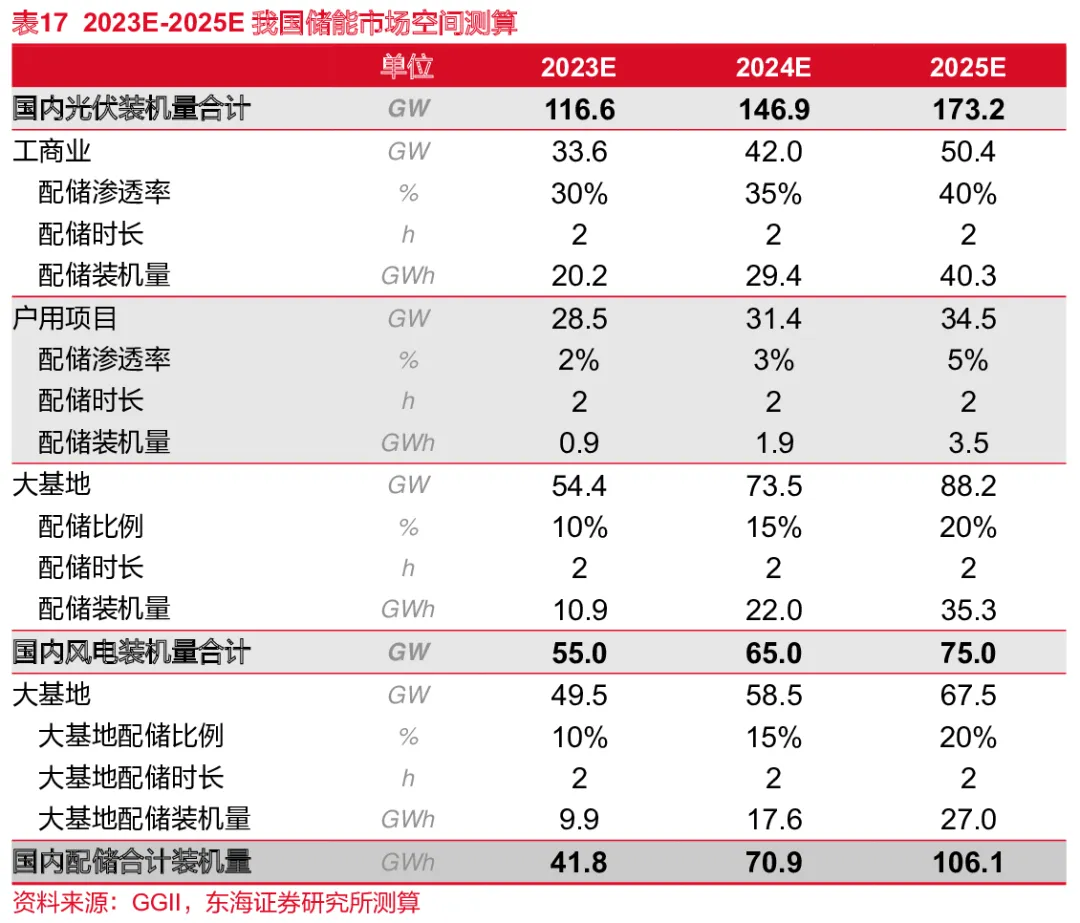 随着全国各省峰谷价差愈发扩大,工商业配储盈利性提升,配储渗透率逐年提升,我们假设2023/2024/2025年新增工商业配储渗透率为30%/35%/40%。基于全国各省市大基地的强制配储政策,假设2023/2024/2025年新增大基地配储渗透率为10%/15%/20%,未来新增的风光配储时长约2h。