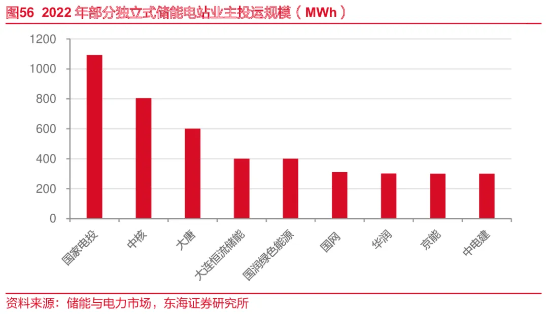 目前我国独立式储能项目最大业主仍为各大央企。由于盈利存在不确定性,同时很多项目是通过内部协调租赁的方式,独立式储能项目最大业主仍为各大央企。根据储能与电力市场数据,2022年中核汇能、中能建、中广核、华电、大唐等央企招标规模均达到GWh级别,国电投、国家能源集团、华润、京能等央企凭借多个大型独立式储能电站的招投标也达到1GWh以上,国润绿色能源、大连恒流储能等民企开发商也凭借地域资源优势建有一定规模。