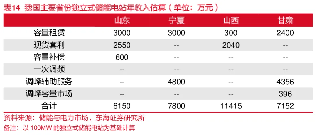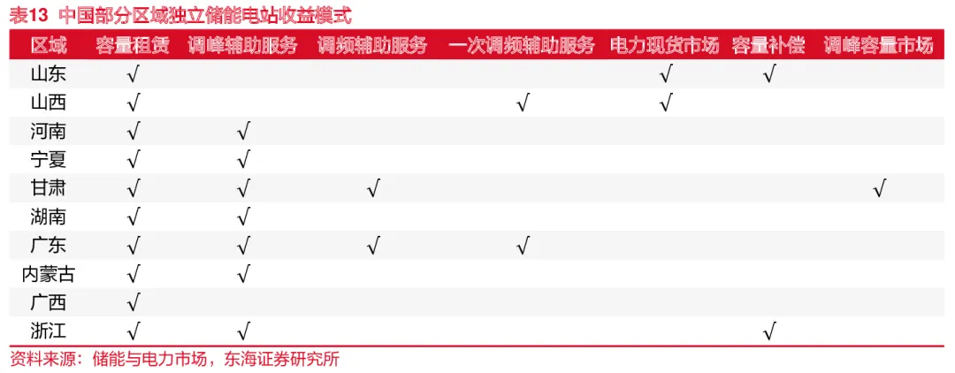 我国独立式储能收益更加多样化。风光发电站配储收益来自于提升消纳率,相较而言,独立式储能电站收益来源更加多样化,目前市场推行的收益模式主要有两种:1)容量租赁+现货市场套利;2)容量租赁+调峰辅助服务,现货市场套利和调峰辅助服务互斥。