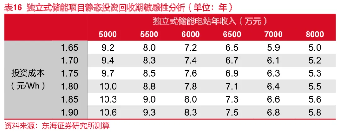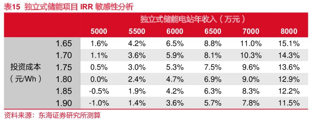 当独立储能电站的年收入为6000万元,IRR约4.7%,投资回收期约7.8年;当独立储能电站的年收入为8000万元,IRR约12.9%,投资回收期约5.5 年。我们预计随着储能行业趋于成熟,规模效应带来的投资成本下降,以及独立式储能电站盈利模式能力的扩充,项目的投资前景可期。