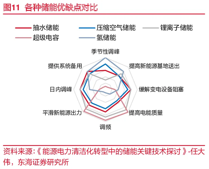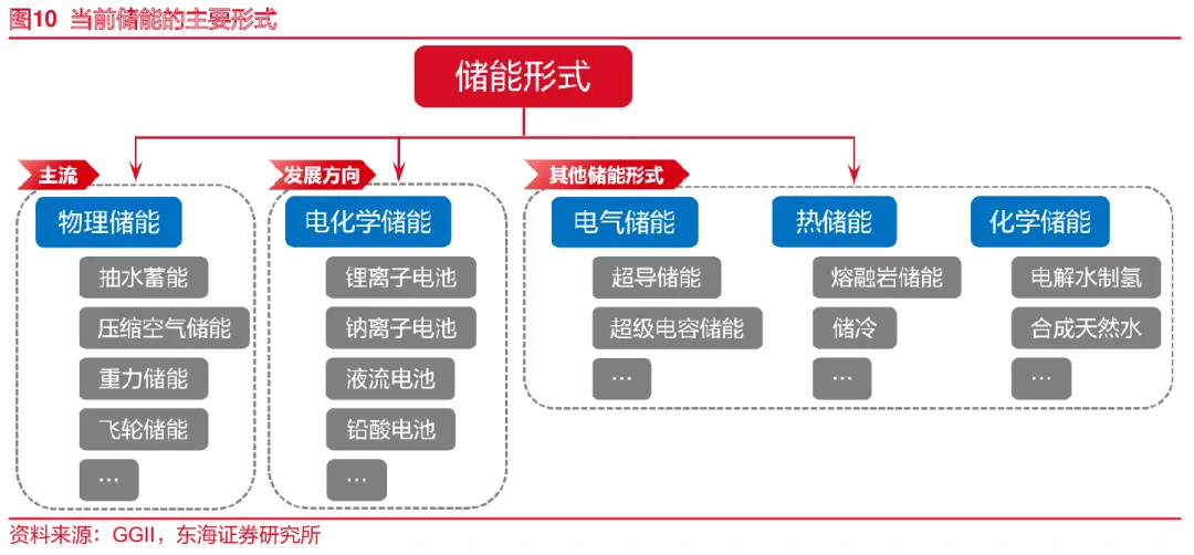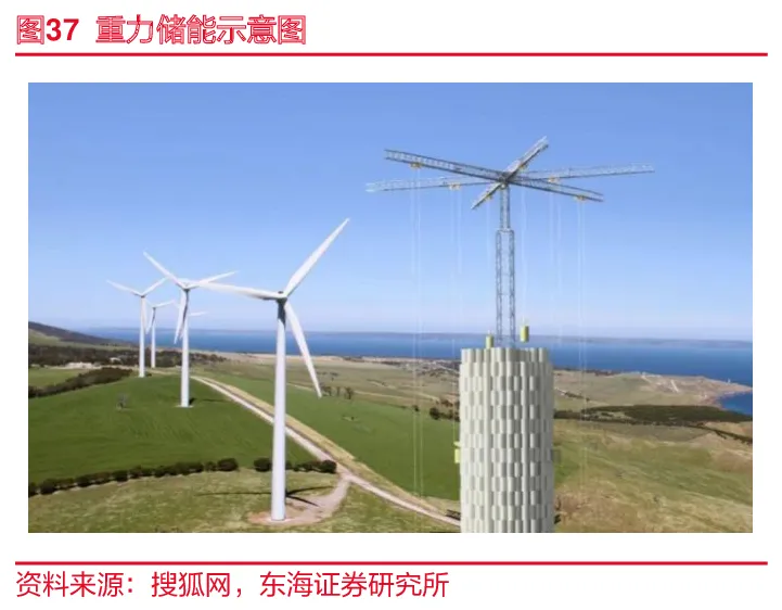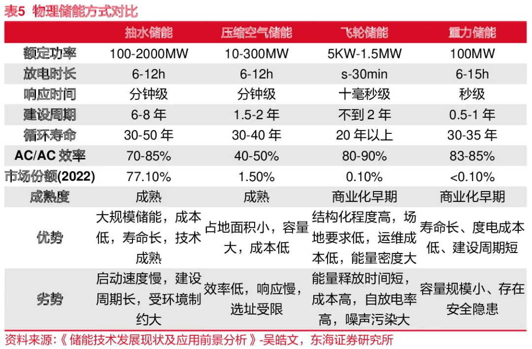 1)物理储能包括抽水储能、压缩空气储能、重力储能和飞轮储能等,其中抽水储能容量大、度电成本低,是目前物理蓄能中应用最多的储能方式;