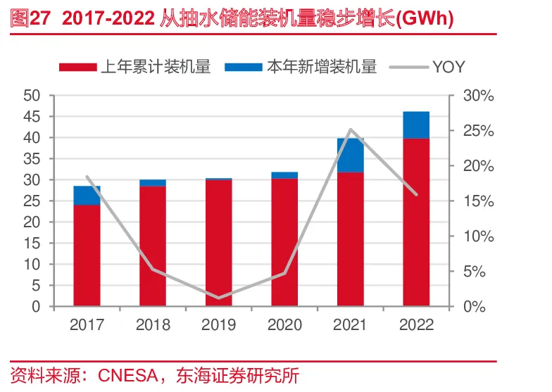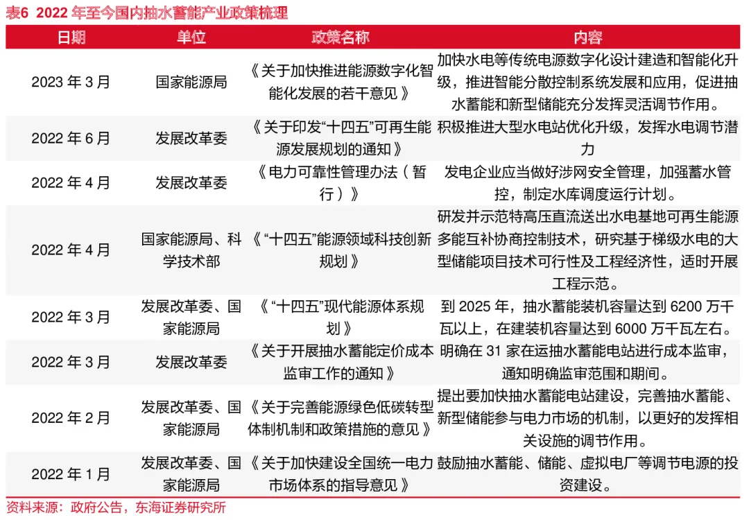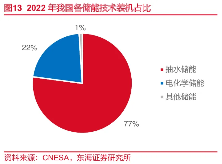 为适应当前新型电力系统建设和新能源消纳需求,抽水蓄能电站建设同样被确立为“十 四五”时期储能行业发展的重点。2023 年 3 月国家能源局发布《关于加快推进能源数字化智能化发展的若干意见》,提出要加快水电等传统电源数字化设计建造和智能化升级,推进智能分散控制系统发展和应用,促进抽水蓄能和新型储能充分发挥灵活调节作用。