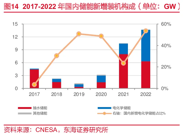从存量市场看,抽水蓄能为主体,锂电储能在新型储能中独占鳌头。从总量上看,2022年我国电力储能累计装机规模达到59.8GW,占全球市场总规模 25%,同比上升3pct,中国市场正成为全球最重要的市场之一。从结构上看,抽水蓄能依然是主体,占比达到 77%, 新型储能紧随其后,占比22%,其中锂离子电池占比20.6%,是新型储能中的核心构成。