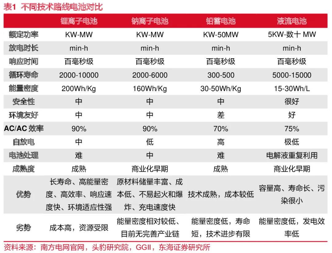 不同电池路线对比下,锂离子电池目前优势显著,预计到2025年锂离子电池依旧是主流储能电池,钠离子电池和液流电池各有优势,商业化在即。通过对比,可以清晰看到锂电池在能量密度、能量利用率上具备较大优势,同时在其他方面功率、放电时长和响应时间上和其他电池相比也处于同一水准。此外,锂离子电池目前技术成熟,具有明显的先发优势。