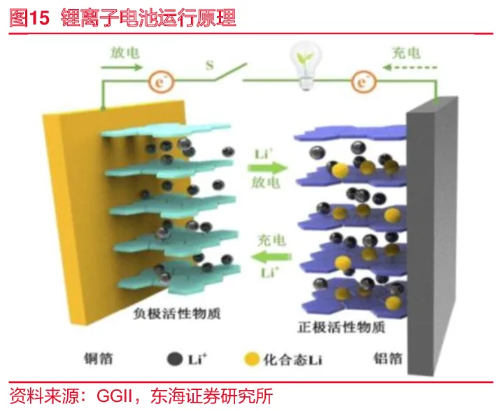 锂离子电池性能优势显著,适合用于储能场景。锂离子电池由正极、负极、隔膜和电解液构成,目前主流产品正极通常采用三元材料、磷酸铁锂、钴酸锂、锰酸锂等,而负极则通常采用石墨等碳素材料。作为一种高效的储能技术,锂离子电池具有能量密度大、没有记忆效应、充放电速度快、响应速度快等优点。这些特性使得它广泛应用于风电光伏等新能源发电侧的配储和用户侧储能项目。其高效的能量转换能力和长寿命使其成为储存电能的一种理想选择,为各种应用提供了可靠的电力供应。