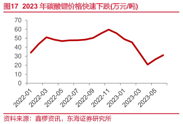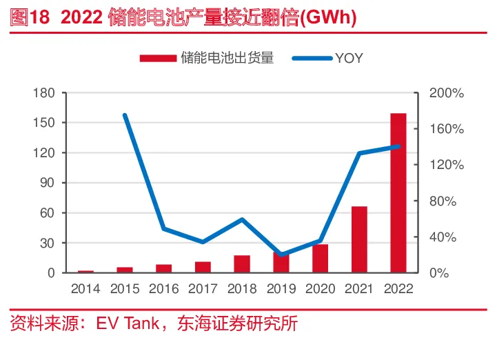 2022 年国内锂电池储能项目备案规模总体处于上升状态,全年国内锂电池储能项目合计释放中标量达 38.4GWh(含 EPC/PC 等环节中标)。映射到生产端,据EV Tank及中国能源网披露数据,2022年全球储能电池产量达到159.3GWh,其中国内出货量 122GWh, 占比超过75%。2023年碳酸锂价格急速下跌后回弹,当前在30万元/吨左右,相比2022年 高点跌幅接近一半,锂电储能经济性提升,预计随着储能市场的持续恢复,储能电池产量将继续保持高增。