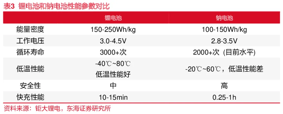 钠离子电池性能优势突出。对比锂离子,钠离子的半径更大,而“摇椅式”电池要求金属离子不断嵌入脱出于负极,显然后者难度更大,因此钠离子电池循环寿命更短;此外由于质量和体积更大,钠离子电池能量密度也更低。但在低温性能、安全性、快充性能等方面钠离子均有着更好的表现,因此钠电十分适合储能、低速车等场景。
