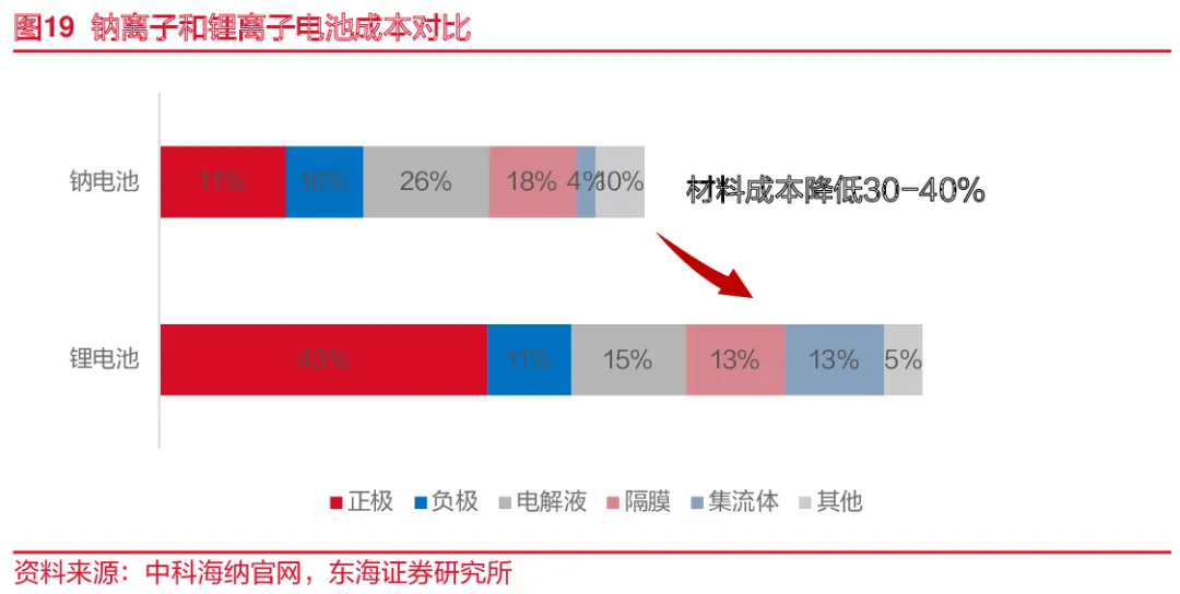 钠离子电池BOM成本约低30-40%,大规模量产后有望更低。根据中科海纳官网数据,由于碳酸钠的成本不到碳酸锂的1%,钠电池的BOM成本,尤其是正极成本远低于锂电池。