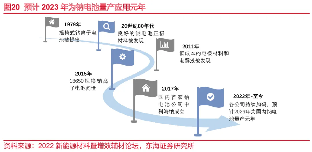 2023 年成为钠电池量产应用的元年,各公司纷纷加码投资。4月16日在奇瑞iCAR品牌之夜上,宁德时代宣布钠离子电池将首发落地奇瑞车型。比亚迪、蜂巢能源、中科海钠、 亿纬锂能、孚能科技等电池开发制造企业先后推进钠离子电池项目。