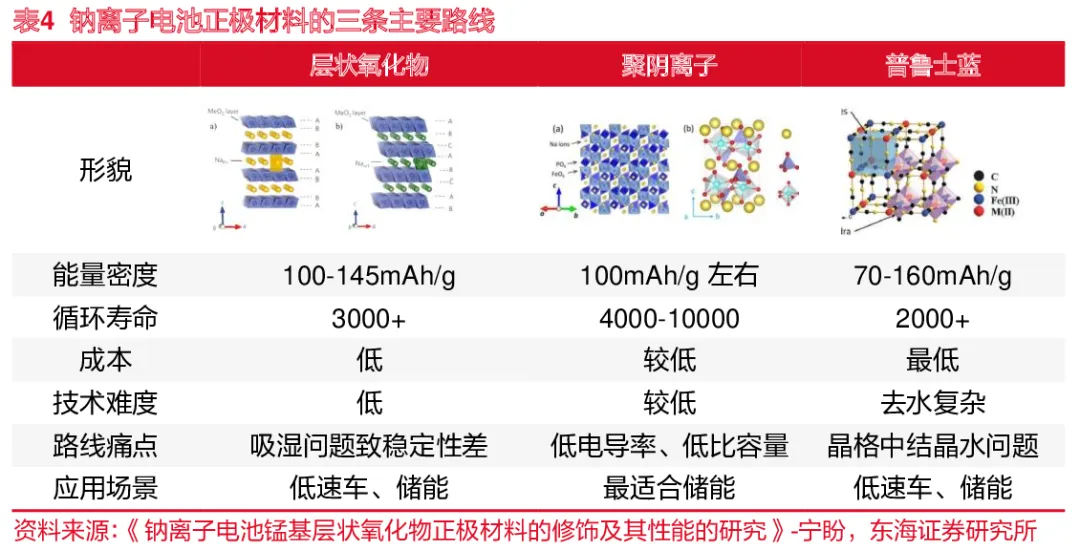 根据钠电正极划分,主流路线主要包括层状氧化物、聚阴离子和普鲁士蓝三种。其中层状氧化物和锂电三元结构类似,皆为层状结构,技术路线相对清晰成熟。尽管因吸湿问题稳定性差,但该路线能量密度高、倍率性能好。聚阴离子循环性能优异,但能量密度低;普鲁士蓝则有结晶水问题,且循环寿命低。