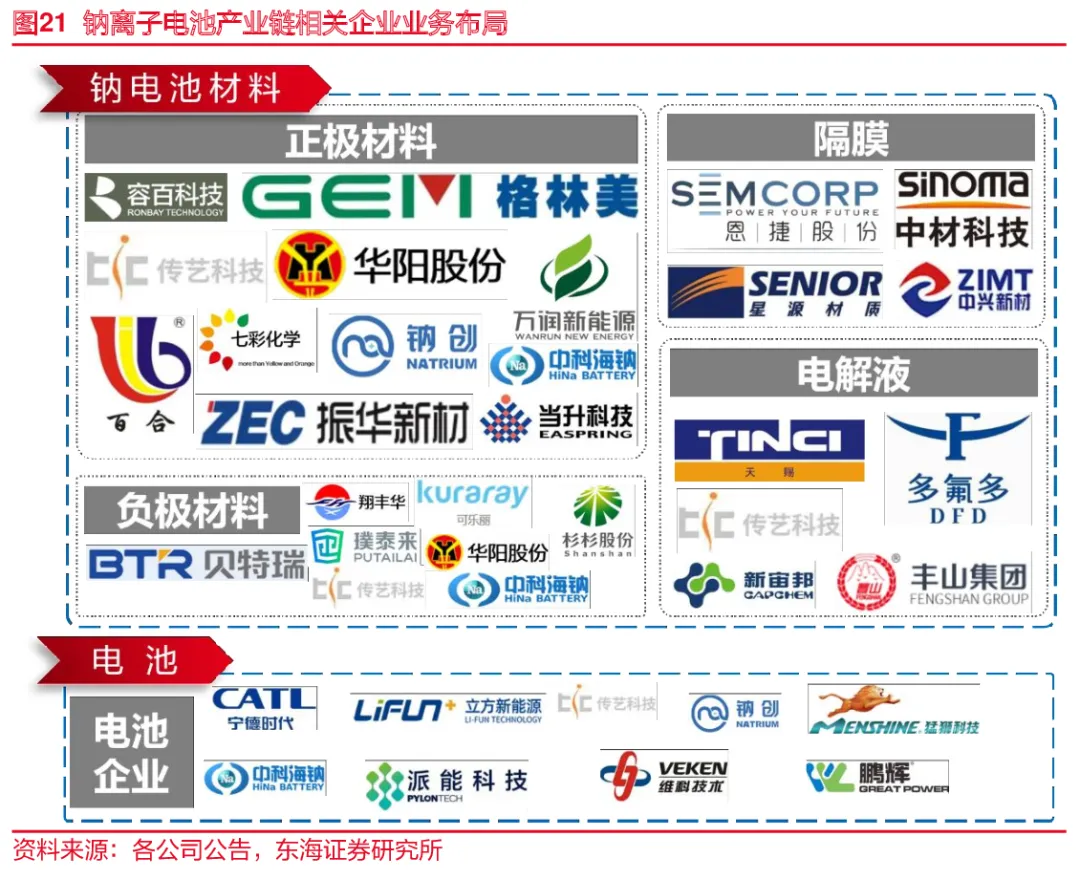 多家企业积极布局钠电池,商业化在即。与锂离子产业链相比,钠离子产业链变化最大的为上游原材料端,目前钠电池产业链进展迅速,上游原材料量产在即,各材料研发不断进步,未来量产后将成本有望得到下降,推动钠电市场规模壮大。