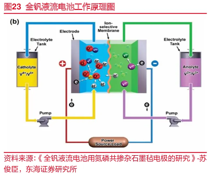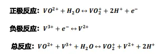 液流电池是一种利用两种化学溶液进行离子交换来进行充放电的电池。其电压一般在1.0-2.2V之间。与其它电池相似,液流电池的功率与隔膜面积成正比,而储存能量的多寡和溶液储存容量成正比。液流电池存在多种不同的形式,但其中全钒液流电池是目前最接近产业化和规模化应用的一种电池。全钒液流电池主要靠钒元素的价态变化来完成正负极的充放电状态。其反应方程式如下: