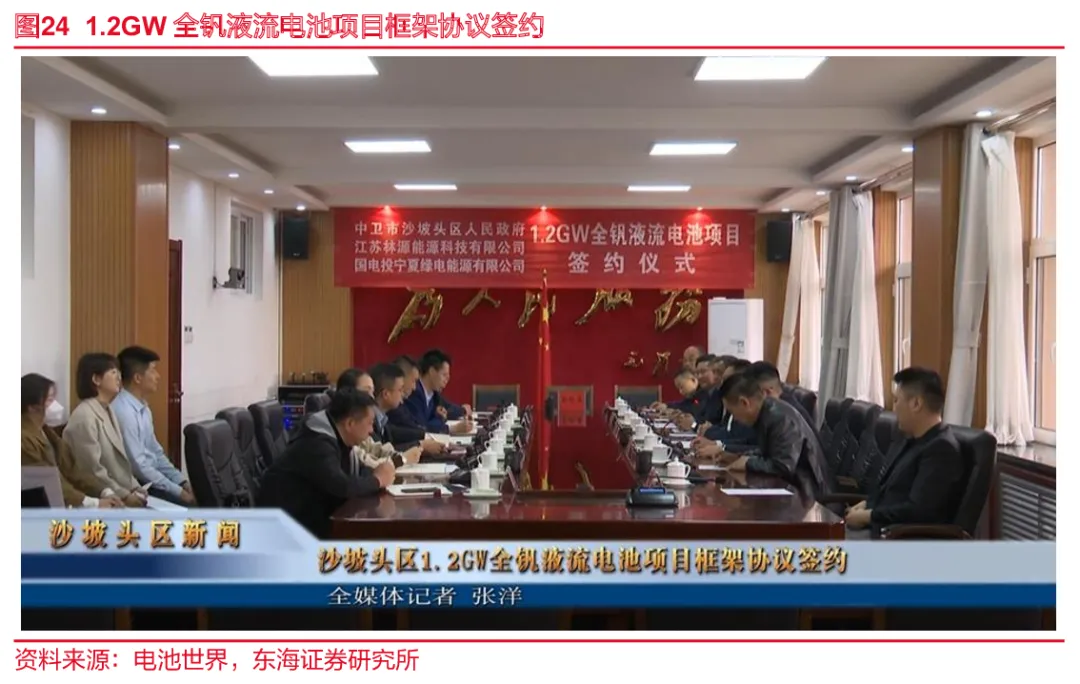 2023年3月,沙坡头区与江苏林源控股集团和国电投宁夏绿电能源有限公司签订了1.2GW全钒液流电池项目框架协议,该项目计划于2023年投资15亿元用于建设全钒液流储能电池生产项目。项目规划投资建设 200MW光伏和200风力发电项目,并在沙坡头 区建立全钒液流储能电池制造工厂、储能核心设备研发中心和推广中心。该项目总占地面积 约120亩,全部投产后可达到年产全钒液流电池1.2GWh的生产能力,年产值预计约40亿元。
