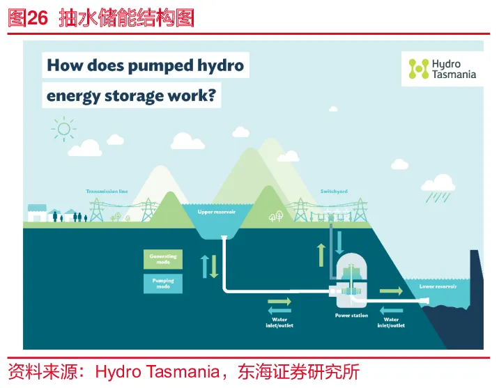 抽水蓄能是目前最为成熟的储能技术之一,截至 2022年占全球投运储能项目累计装机容量比例已达到77%。抽水蓄能电站将储能和电力发电结合在一起,由水库、水轮机、水泵以及配套输水系统等组成。其运作原理是由两个不同高度的水库组成,中间由管道连接。在波谷时,电能被消耗,电动机将其转换成机械能,而在波峰时,通过水流发电并入电网,电机电泵将水抽到上水库并转化为势能。当电力过剩时,抽水蓄能电站将立即转换为抽水状态, 将电能转换为势能,用电机驱动泵将低处水抽到高处水库中。