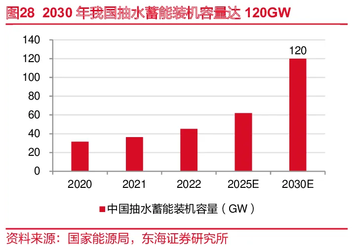 国家能源局发布的《抽水蓄能中长期发展规划(2021-2035 年)》提出,到2025年我国抽水蓄能投产总规模较“十三五”翻一番,达到0.62亿千瓦以上;到2030年抽水蓄能投产总规模较“十四五”再翻一番,达到1.2亿千瓦左右。