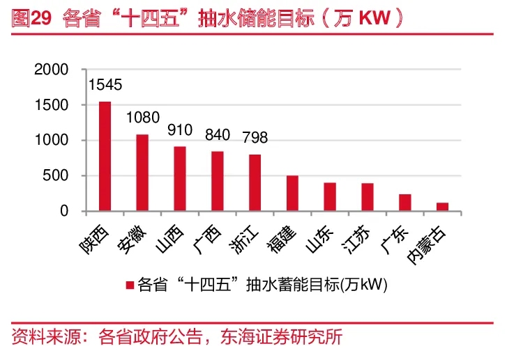 在政策指导下,各省份陆续出台能源发展“十四五”规划,加快推进抽水蓄能电站的建设。全国规划抽水蓄能目标前五的分别为:陕西省确定“十四五”期间抽水蓄能目标为13个抽水蓄能电站,项目装机容量达1545万千瓦;安徽省确定“十四五”期间抽水蓄能目标为9个抽水蓄能电站,项目装机容量达 1080万千瓦;山西省确定“十四五”期间抽水蓄能 目标为8个抽水蓄能电站,项目装机容量达910万千瓦;广西省确定“十四五”期间抽水蓄能目标装机容量达840万千瓦;浙江省确定“十四五”期间抽水蓄能目标装机容量达798万千瓦。