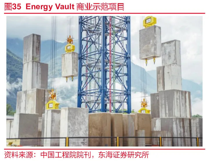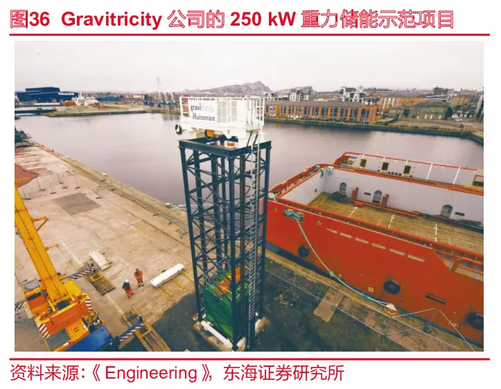 EnergyVault公司于2021年10月宣布,已与美国 DGfuels公司达成交易,为该公司多个项目提供共 1.6GWh的重力储存。该合作将为其带来超过5亿美元的收入。2022年英国爱丁堡的重力储能公司 Gravitricity完成了一个与电网互联的250kW示范项目,其中采用了两个重量为25吨的重物,悬挂高度最高可达15米。Gravitricity现在计划在捷克共和国开 始建设一个全尺寸的重力储能系统,该系统通过在已停止使用的煤矿中升降一个重量为1000吨的重物来实现,其功率可达8MW,储能容量可达2MWh。