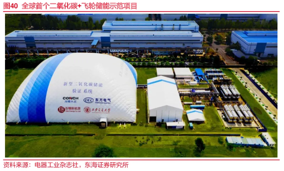 2022年8月25日由东方汽轮机、百穰新能源、西安交通大学能源与动力工程学院、北京泓慧国际能源公司深入合作打造的全球首个二氧化碳+飞轮储能示范项目正式落地。该项目占地1.8万平方米,相当于两个半足球场大小,其储能规模为10MW/20MWh,能够在2小时内存储2万度电。该项目是全球单机功率最大、储能容量最大的二氧化碳储能项目,也是全球首个二氧化碳+飞轮储能综合能源站。