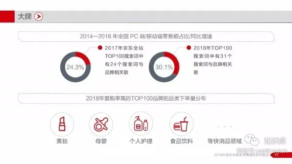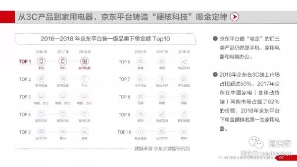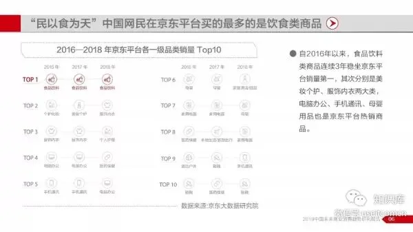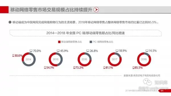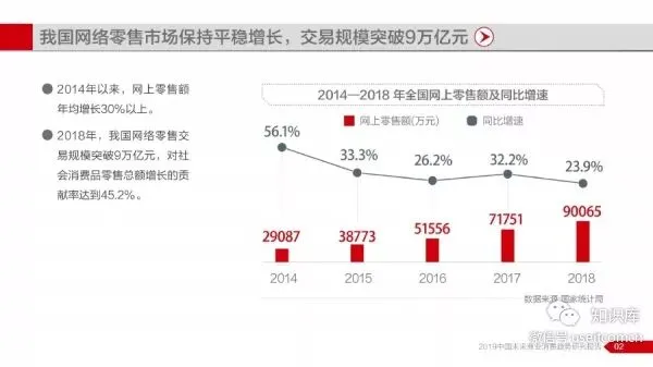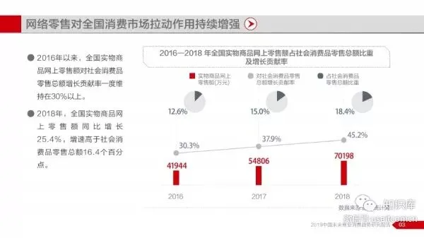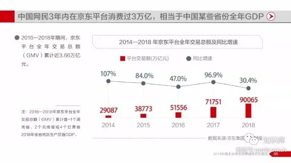 报告显示,2014年至2018年期间中国互联网商业历经快速发展,全国网络零售市场保持平稳增长,并在2018年交易规模突破9万亿元,同时网络零售对全国消费市场拉动作用持续增强,对社消零总额增长贡献率一度维持在30%以上。网络购物已成为国民生活不可缺少的一部分,以京东平台为例,2016—2018年期间,京东平台全年交易总额(GMV)累计近3.66万亿元。