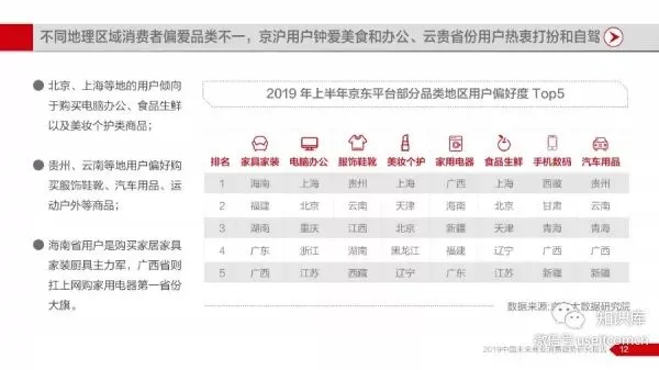 报告同时对中国网购消费者进行了画像分析,发现不同性别消费者购物特征差异明显,男性用户更喜欢汽车用品、手机数码、电脑等“智能化”产品品类;女性用户则更喜欢美妆、母婴、图书、食品、宠物等“精致生活”品类。另外,不同年龄段用户购物行为特征也比较鲜明,90后追求品质、80后顾家、70后享受生活;不同地理区域消费者偏爱品类非常多元,京沪用户钟爱美食和办公、云贵省份用户热衷打扮和自驾,海南省用户是购买家居家具家装厨具主力军,广西省则扛上网购家用电器第一省份大旗。