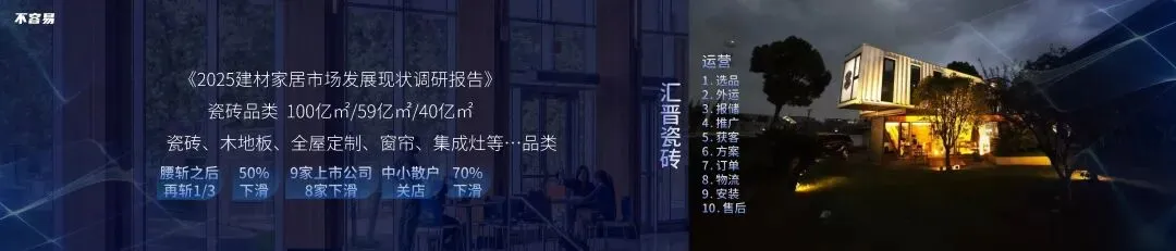 再分享个不容易的案例,我们材料美学馆的合作伙伴 —— 汇晋瓷砖的王总。三年前,他果断从传统家居卖场迁出,入驻智慧湾,以 50 平方米的集装箱作为展厅。如今,他的业务流程仍涵盖进口瓷砖选品至售后的 10 个环节,仓库面积达 2000 平方米,展厅也从 50 平方米扩展至 500 平方米。