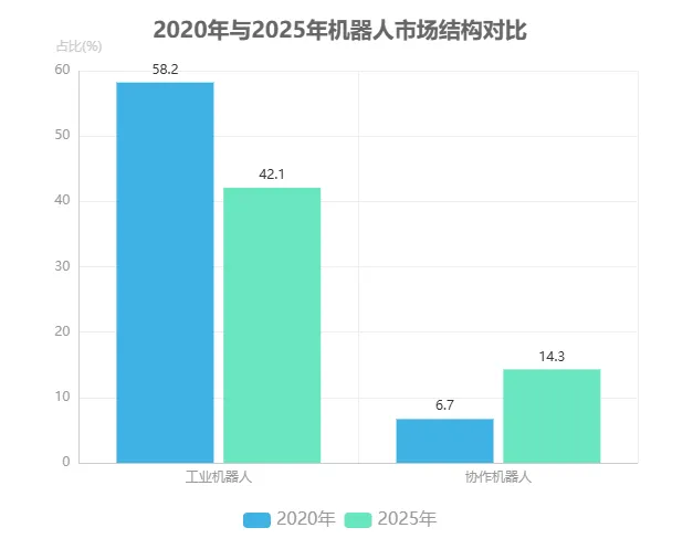 全球机器人行业正处于技术迭代与市场扩张的双重驱动期,2025年预计市场规模突破5000亿美元,其中服务机器人以25.3%的复合增长率领跑细分领域,工业机器人增速稳定在12.8%,特种机器人维持18.5%的增长态势。从市场结构看,工业机器人占比从2020年的58.2%持续下降至2025年的42.1%,协作机器人占比则从6.7%提升至14.3%,反映出制造业柔性化转型需求;服务机器人中,医疗机器人与家庭服务机器人分别占据19.4%和31.2%的市场份额,成为消费级与专业级市场的核心增长极。