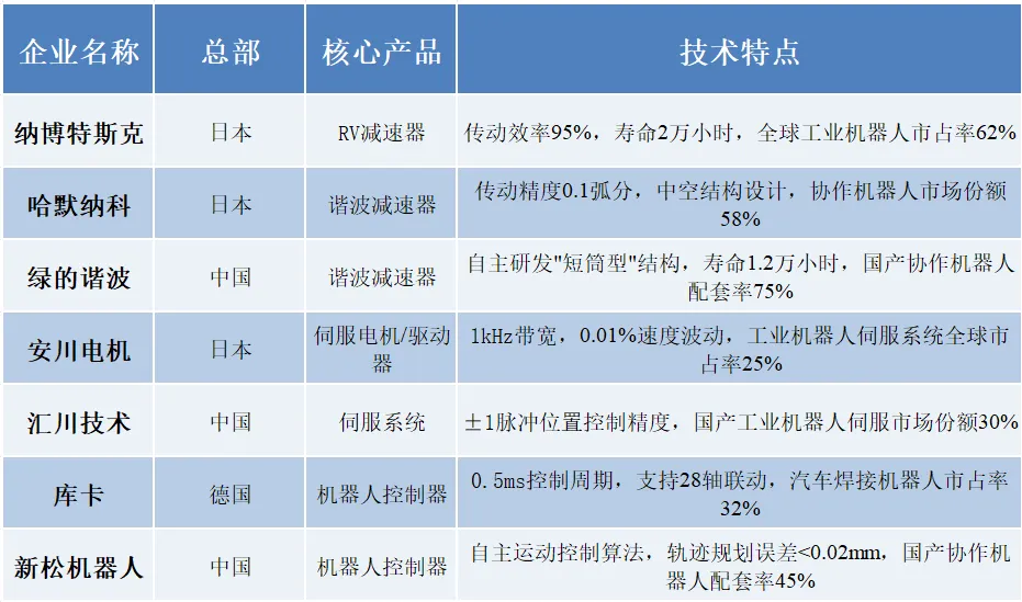 机器人产业链上游核心环节主要包括精密减速器、伺服系统、控制器三大核心零部件,这些组件直接决定机器人的运动精度、响应速度与控制性能,其技术壁垒与市场集中度均处于产业链最高水平。以下按"核心零部件类型-技术特征-代表企业"逻辑展开分析: