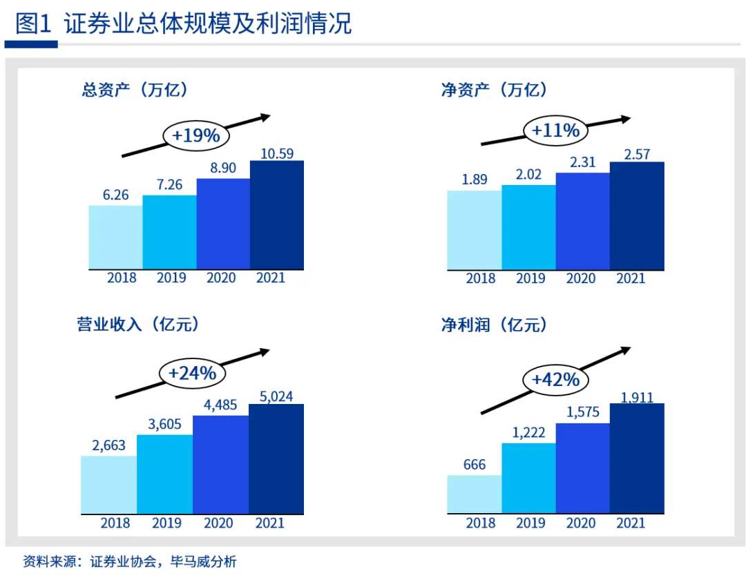 2021年是证券行业关键的一年:注册制改革持续推进、北京证券交易所开市、市场开放不断深化。证券行业业绩稳健增长,高质量发展取得积极成效。2022年以来,国内疫情发展、国际形势变化,美联储加快退出宽松政策的影响,是市场面临的重要不确定因素,一季度券商受市场大幅波动影响整体业绩承压。目前,资本市场全面深化改革正在向纵深推进,券商作为资本市场重要参与者,正不断提升专业服务能力,奋楫笃行,共谱新时代高质量发展新篇章。