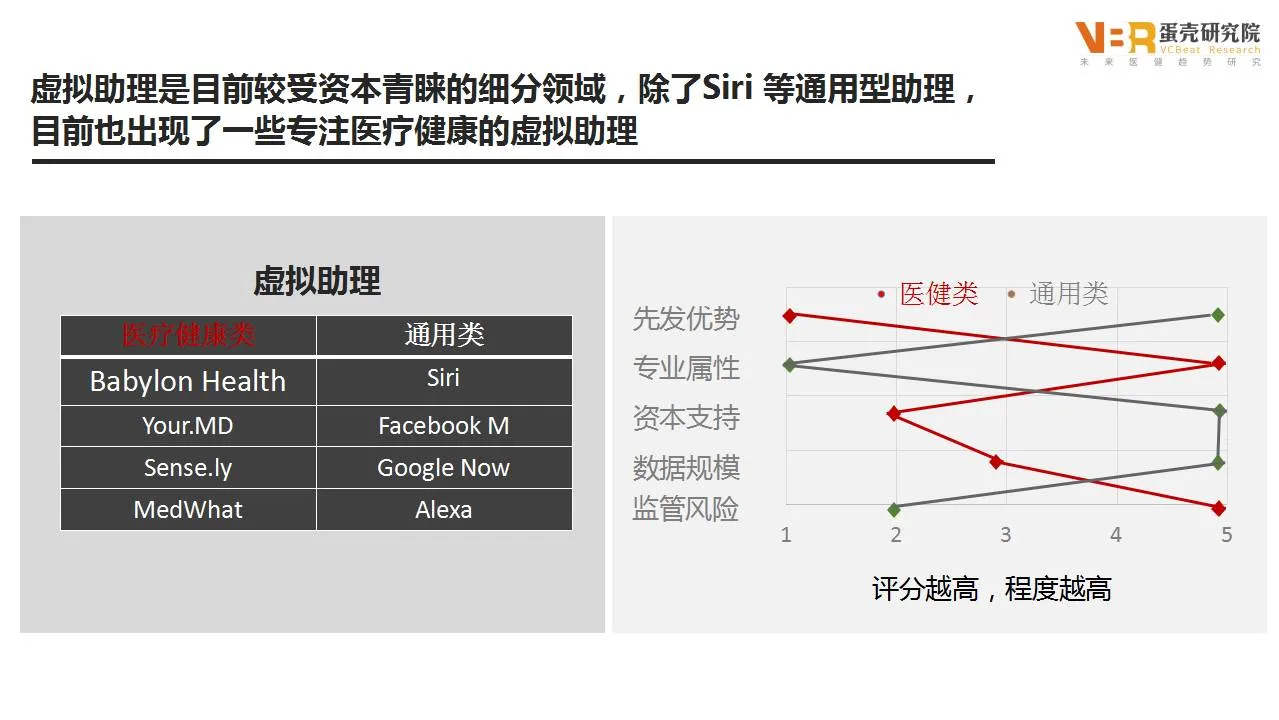 我们把虚拟助理分成两类,一类是包括Siri等通用型虚拟助理,另一类是专注医疗健康类的专用虚拟助理。和通用类型助理相比,医疗是一个更垂直,专业度更高的领域,有很多专业术语和专业技能需要我们去学习。我们从五个方面去对比通用类和医健类虚拟助理的差别。通用类虚拟助理上市时间早,资本支持度高,数据规模大。而医健类虚拟助理的专业属性强、监管风险高。虚拟助理是目前较受资本青睐的人工智能医疗健康细分领域,目前在国外用户所熟知的医健虚拟助理是Babylon Health,而国内在虚拟助手上,也有大数医达和康夫子崭露头角。