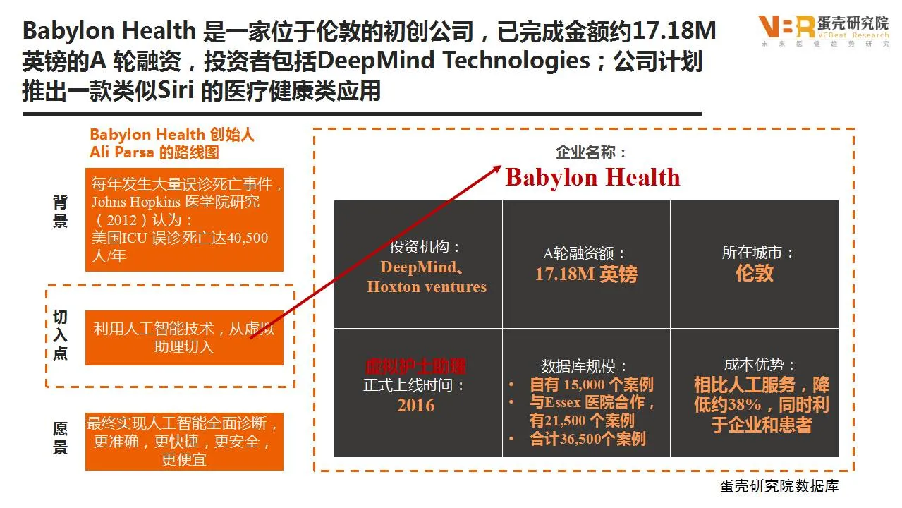 Babylon Health是一家位于伦敦的初创公司,已完成金额约17.18M英镑的A轮融资,投资者包括DeepMind Technologies,该公司计划推出一款类似Siri的医健类虚拟助理应用。Babylon在过去两年里建立了一个庞大的医学症状数据库,拥有总共36500个案例的数据库,在看医生前利用语音识别来询问用户一系列问题。相比人工全科医生的诊疗,这种光速般的症状诊断和热情温柔的声音是帮助Babylon Health降低价格、保持5英镑月费的最重要方法。