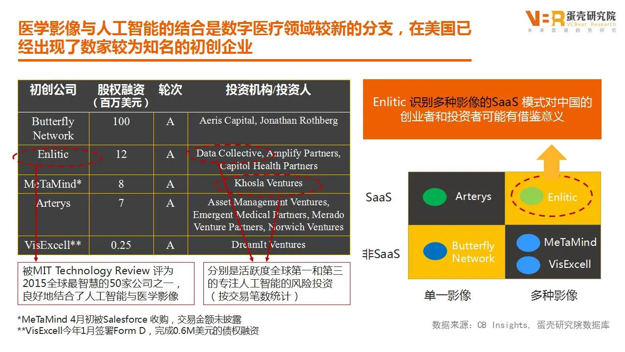 在国外,已经出现了数家较为知名的初创企业。表格中的Enlitic就是一家比较知名的人工智能医学影像企业,虽然创立于2014年,但次年就被MIT Technology Review评为2015全球最智慧的50家公司之一,获得总计1500万美元的融资。Butterfly正在研发一种小型超声设备,这套系统主要依靠软件来运行,包括用人工智能专家开发的技术来梳理一系列图像,从而提炼出可以自动进行疾病诊断的功能。活跃度全球第一和第三的专注人工智能的风险投资机构也纷纷成为智能医学影像初创企业的投资人。
