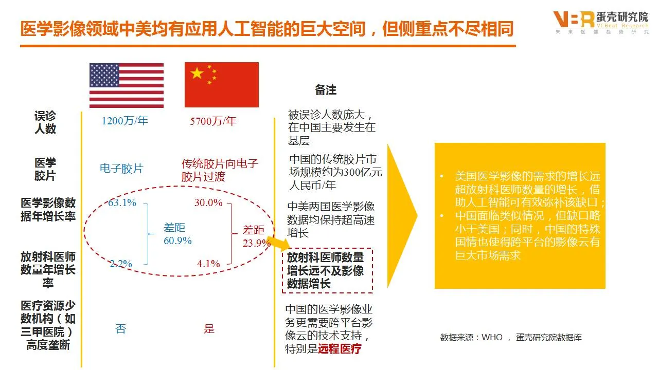 我们对比了中国和美国的医学影像现状,从影像方面的误诊人数来看,美国每年的误诊人数达到了1200万,而中国因为人口基数庞大,达到了惊人的5700万/年,这些误诊主要发生在基层医疗机构。目前中国的医学影像正在从传统的胶片向电子胶片过渡,而美国传统胶片已经成为历史。电子胶片的广泛使用使得医学影像数据大幅度增长,美国的数据年增长率达到了63.1%,在中国也达到了30%。放射科医生的年增长率美国和中国仅仅只有2.2%和4.1%,远远低于影像数据的增长,形成了巨大的缺口。这意味着医师工作量大增,判断准确性下降,借助人工智能对影像进行判断则能有效弥补该缺口。在国内这个缺口略小于美国,但我们的特殊国情也使得跨平台的影像云有巨大市场需求。