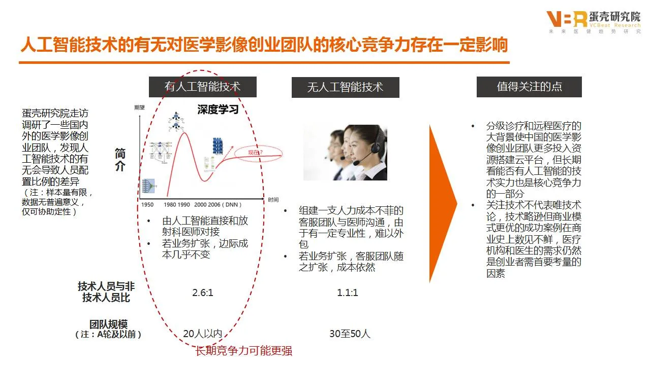 前面我们分析了人工智能对患者、医生和医院所带来的好处,在医学影像企业中,人工智能技术的加入对创业团队的核心竞争力也有非常大的影响。根据动脉网对医学影像初创企业的走访,拥有人工智能技术,整个团队能显著减少人力成本,技术团队规模在A轮以前可以控制在20人以内,技术人员和非技术人员的比例达到2.6:1。如果没有人工智能技术,那么就要组件一只人力成本不菲的客服团队和医师沟通,技术人员和非技术人员的比例为1.1:1,规模也达到了30至50人。分级诊疗和远程医疗的大背景使中国的医学影像创业团队更多的投入资源搭建云平台,但长期看能否有人工智能的技术实力也是核心竞争力的一部分。