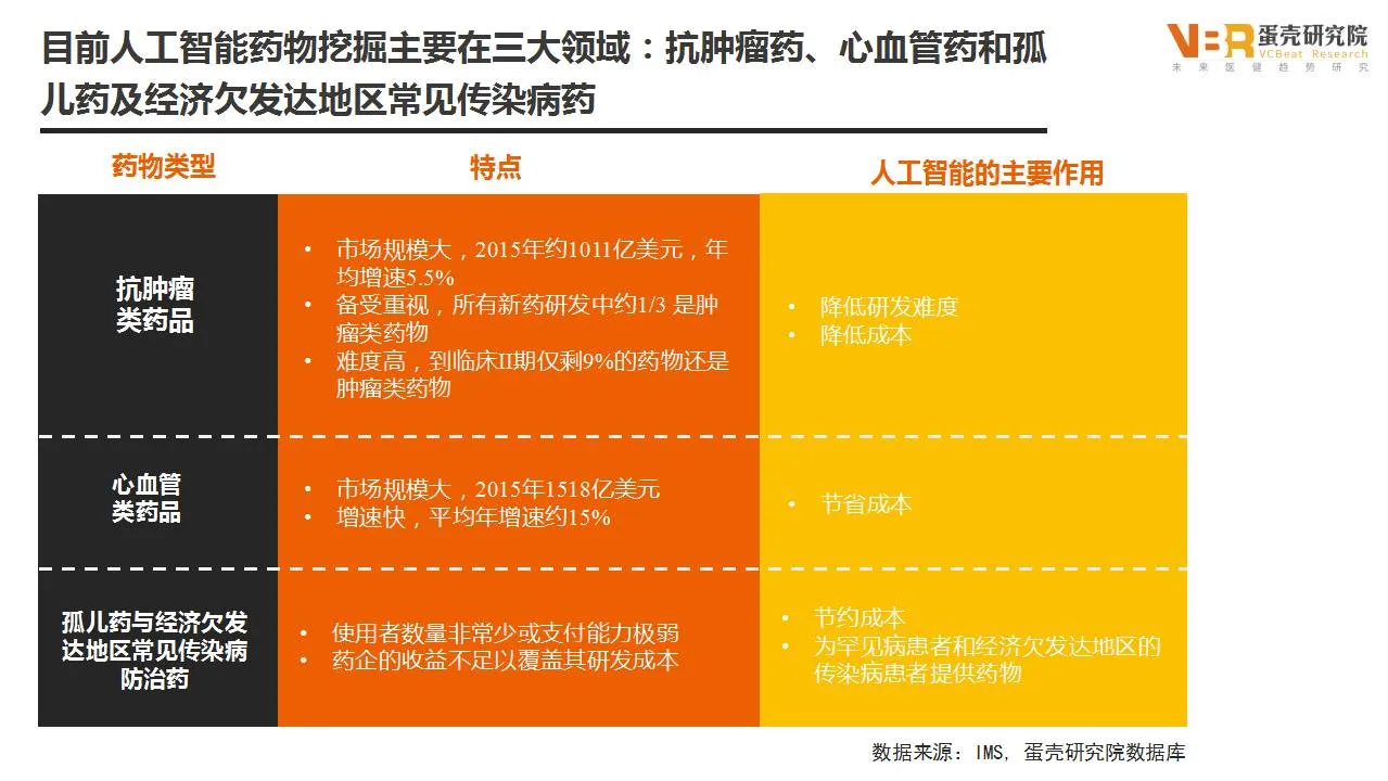 目前人工智能药物挖掘主要在三大领域:抗肿瘤药、心血管药和孤儿药及经济欠发达地区常见传染病药。抗肿瘤药和心血管药的共同特点就是市场规模大、增速快,2015年的销售金额都超过了1000亿美元。利用人工智能对药物进行挖掘,可以显著降低成本和开发难度。而第三种类别的药物孤儿药与经济欠发达地区常见传染病防治药,因为市场价值低,药企的收益不足以覆盖其研发成本,企业积极性不大。那么利用人工智能可以节约成本,为罕见病患者和经济欠发达地区的传染病患者提供药物。