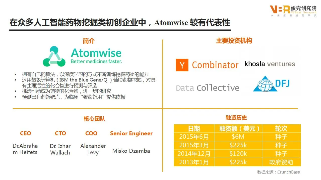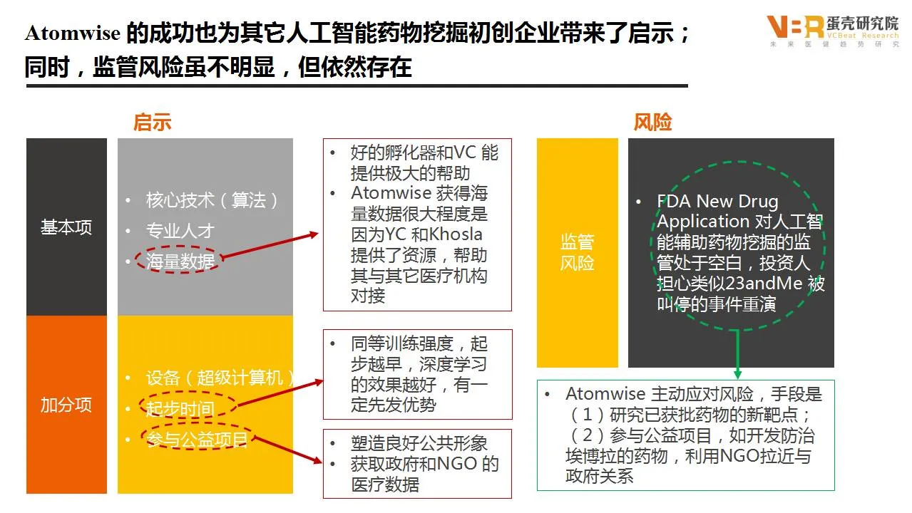 到目前为止,Atomwise总共获得了657万美元的投资,他的成功除了在人工智能领域的独特算法和专业人才之外,还有好的孵化器和VC投资者。知名早期创业公司孵化器Y Combinator 和风险投资公司khosla ventures提供了海量的数据资源,并帮助其对接其他医疗机构。为了避免FDA New Drug Application对人工智能辅助药物挖掘的监管风险,Atomwise主动参与开发防治埃博拉的药物,并参与公益项目树立良好的公共形象。