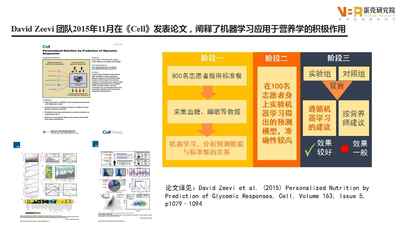 David Zeevi团队2015年11月在《Cell》发表论文,阐释了机器学习应用于营养学的积极作用。研究者分析了三组不同的数据,其中第一组数据来自800名志愿者。他们每天第一顿食用四套标准化食品中的一种,其余时间正常饮食。研究者采集了他们的血样、粪便,以血糖数据、肠道菌群等多项数据,并使用调查问卷、App等形式收集食物、锻炼以及睡眠数据。数据收集持续一周。