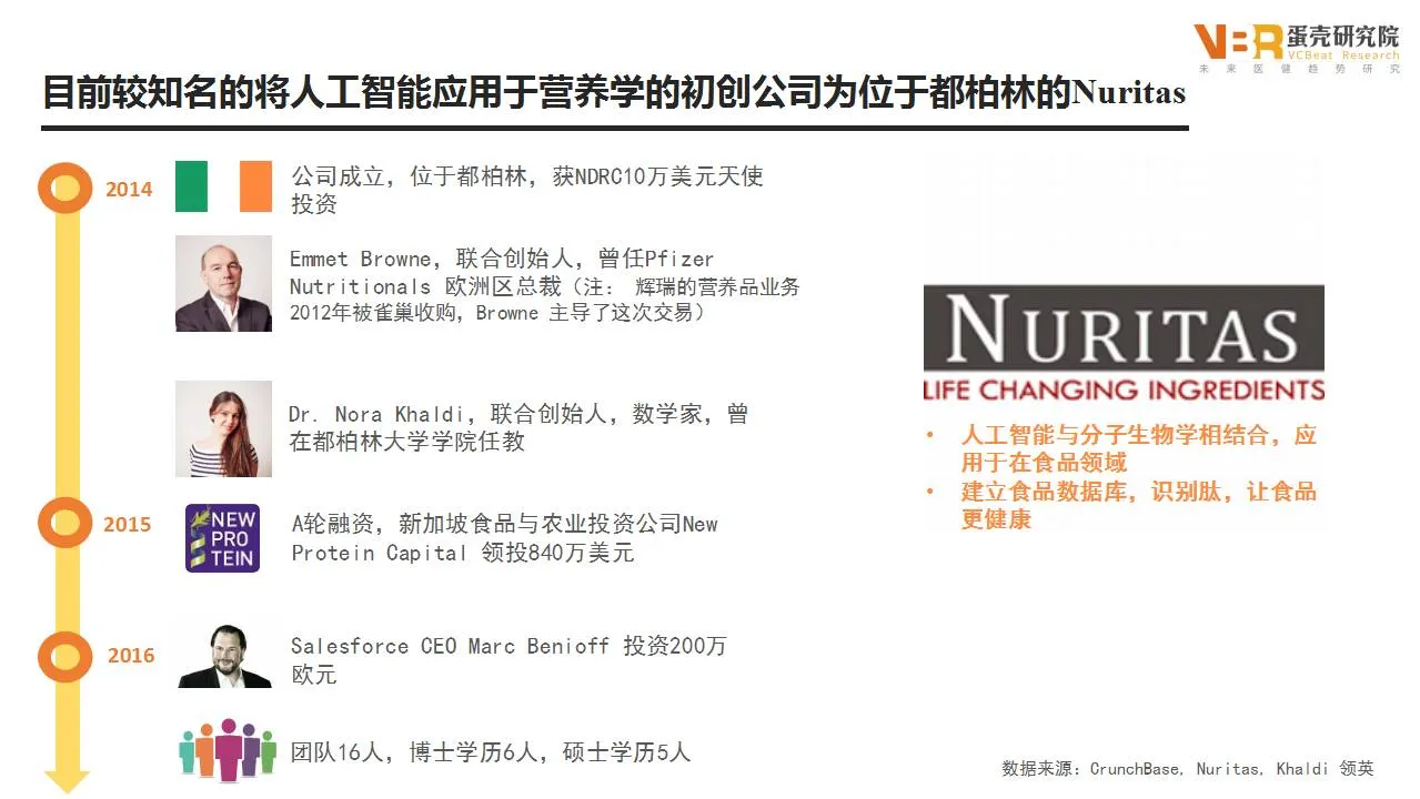 目前较知名的将人工智能应用于营养学的初创公司为位于都柏林的Nuritas。Nuritas通过新开发的人工智能与分子生物学相结合的新技术在食品领域引起了巨大的争议。Nuritas通过建立食品数据库识别肽(食品类产品中的某些分子)可以作为食物的补充或新的成分。这种识别不只是添加蛋白粉摇一摇。相反,Nuritas是识别可以使食物根据身体反应不同而生成不同的肽。例如,其联合创始人Dr. Nora Khaldi接受采访时就表示,公司发现某种谷物可以用于控制2型糖尿病或抗衰老成分。